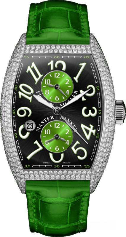 Часы Franck Muller Master Banker Asia Exclusive представлены в корпусе из нержавеющей стали размером 39.6 x 55.4 мм водонепроницаемостью 30 метров. Внутри корпуса установлен автоматический механизм, Калибр MVD 2800-MBSC, обладающий запасом хода 42 часа. На черном с зеленым циферблате отображаются часы, минуты, секунды, дата, время второго часового пояса. Часы поставляются на ремешке из кожи аллигатора с вставкой из нержавеющей стали. Корпус инкрустирован белыми бриллиантами.
