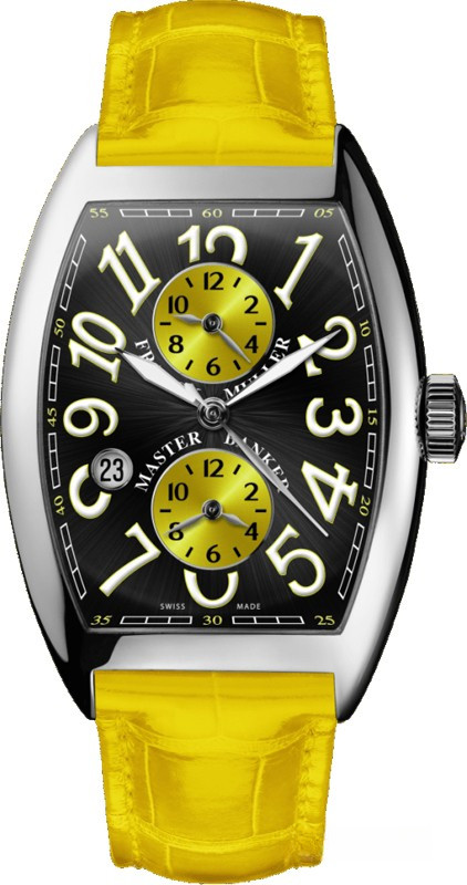 Часы Franck Muller Master Banker Asia Exclusive представлены в корпусе из нержавеющей стали размером 39.6 x 55.4 мм водонепроницаемостью 30 метров. Внутри корпуса установлен автоматический механизм, Калибр MVD 2800-MBSC, обладающий запасом хода 42 часа. На черном с желтым циферблате отображаются часы, минуты, секунды, дата, время второго часового пояса. Часы поставляются на ремешке из кожи аллигатора с вставкой из нержавеющей стали.