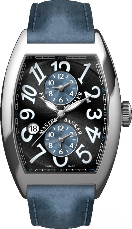 Часы Franck Muller Master Banker Asia Exclusive представлены в корпусе из нержавеющей стали размером 39.6 x 55.4 мм водонепроницаемостью 30 метров. Внутри корпуса установлен автоматический механизм, Калибр MVD 2800-MBSC, обладающий запасом хода 42 часа. На черном с синим циферблате отображаются часы, минуты, секунды, дата, время второго часового пояса. Часы поставляются на кожаном ремешке с вставкой из нержавеющей стали.