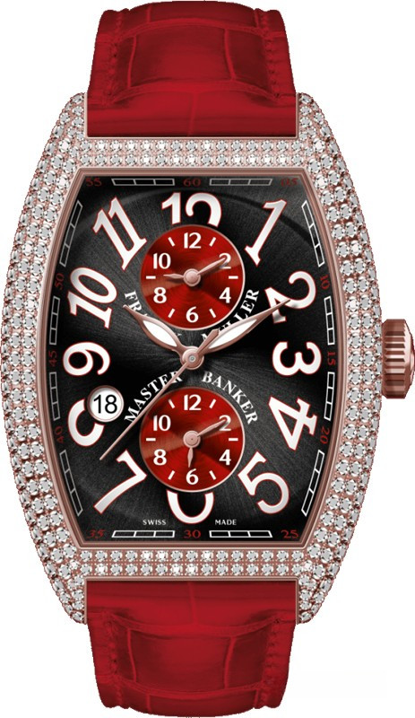 Часы Franck Muller Master Banker Asia Exclusive представлены в корпусе из розового золота 18к размером 39.6 x 55.4 мм водонепроницаемостью 30 метров. Внутри корпуса установлен автоматический механизм, Калибр MVD 2800-MBSC, обладающий запасом хода 42 часа. На черном с красным циферблате отображаются часы, минуты, секунды, дата, время второго часового пояса. Часы поставляются на ремешке из кожи аллигатора с вставкой из розового золота 18к. Корпус инкрустирован белыми бриллиантами.