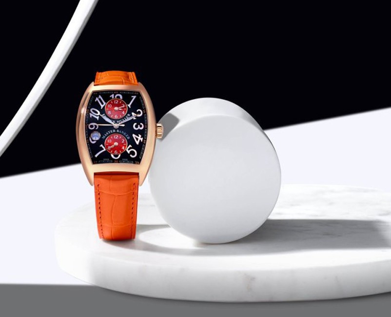 Часы Franck Muller Master Banker Asia Exclusive представлены в корпусе из розового золота 18к размером 39.6 x 55.4 мм водонепроницаемостью 30 метров. Внутри корпуса установлен автоматический механизм, Калибр MVD 2800-MBSC, обладающий запасом хода 42 часа. На черном с оранжевым циферблате отображаются часы, минуты, секунды, дата, время второго часового пояса. Часы поставляются на ремешке из кожи аллигатора с вставкой из розового золота 18к.
