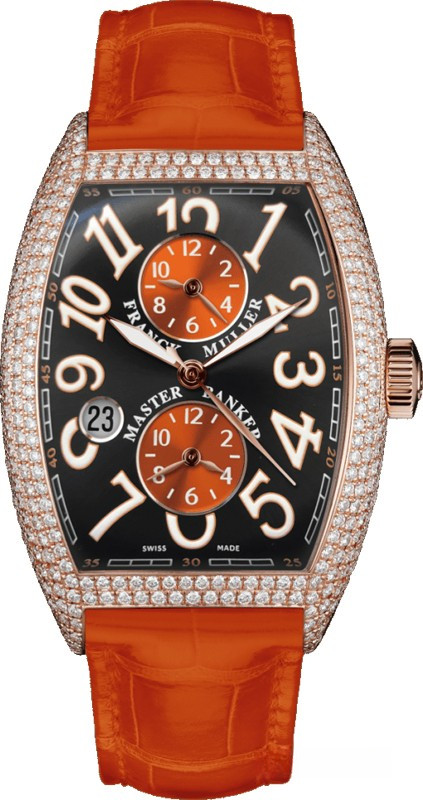 Часы Franck Muller Master Banker Asia Exclusive представлены в корпусе из розового золота 18к размером 39.6 x 55.4 мм водонепроницаемостью 30 метров. Внутри корпуса установлен автоматический механизм, Калибр MVD 2800-MBSC, обладающий запасом хода 42 часа. На черном с оранжевым циферблате отображаются часы, минуты, секунды, дата, время второго часового пояса. Часы поставляются на ремешке из кожи аллигатора с вставкой из розового золота 18к. Корпус инкрустирован белыми бриллиантами.
