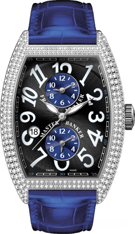 Часы Franck Muller Master Banker Asia Exclusive представлены в корпусе из нержавеющей стали размером 39.6 x 55.4 мм водонепроницаемостью 30 метров. Внутри корпуса установлен автоматический механизм, Калибр MVD 2800-MBSC, обладающий запасом хода 42 часа. На черном с синим циферблате отображаются часы, минуты, секунды, дата, время второго часового пояса. Часы поставляются на ремешке из кожи аллигатора с вставкой из нержавеющей стали. Корпус инкрустирован белыми бриллиантами.