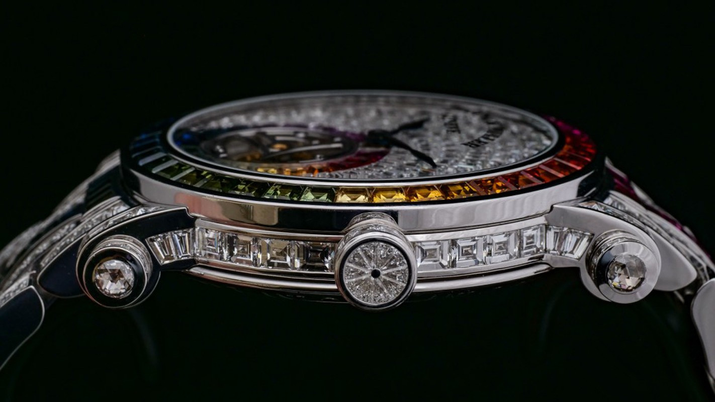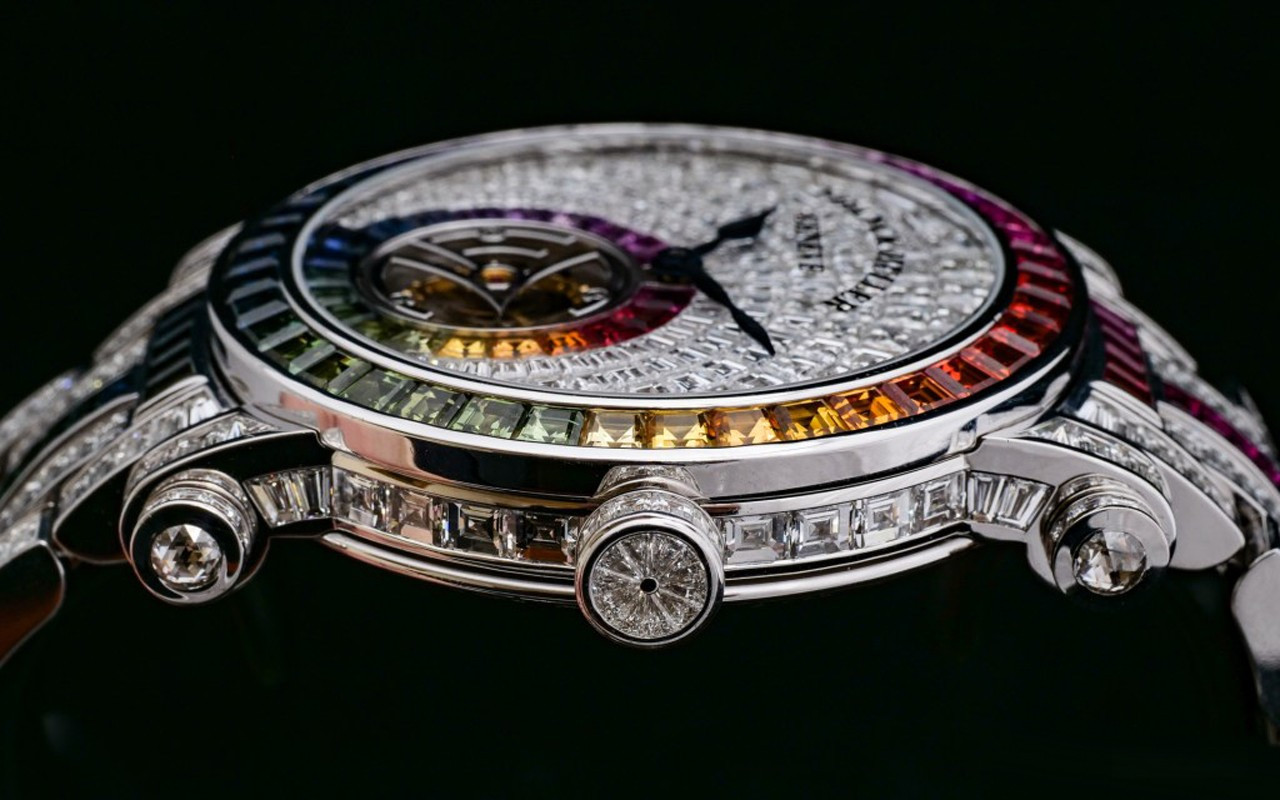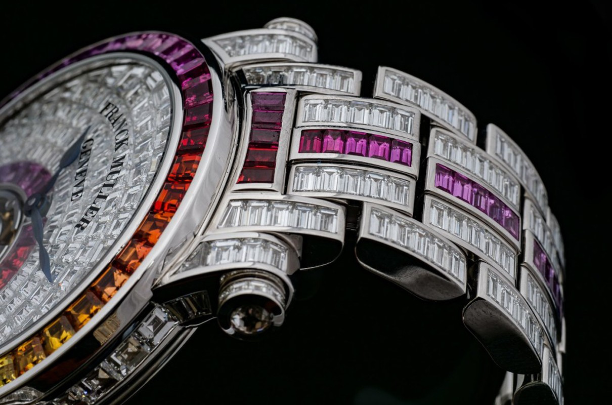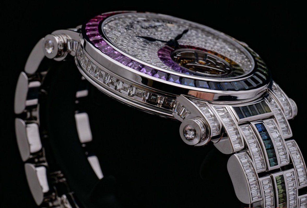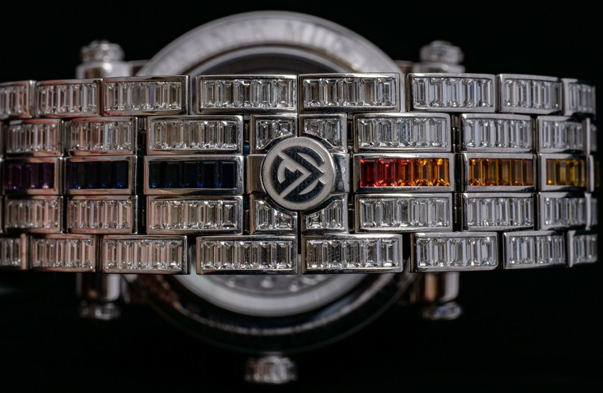 Часы Franck Muller Classic Elegance Tourbillon Rainbow представлены в корпусе из белого золота 18к с водонепроницаемостью до 30 метров. Внутри корпуса установлен механизм с ручным заводом, обладающий запасом 60 часов. На циферблате с белыми багетными бриллиантами и разноцветными багетнымисапфирами отображаются часы, минуты, турбийон.Часы комплектуются браслетом из белого золота 18к, инкрустированным белыми багетными бриллиантами и разноцветными багетными сапфирами. Корпус инкрустирован белыми багетными бриллиантами.