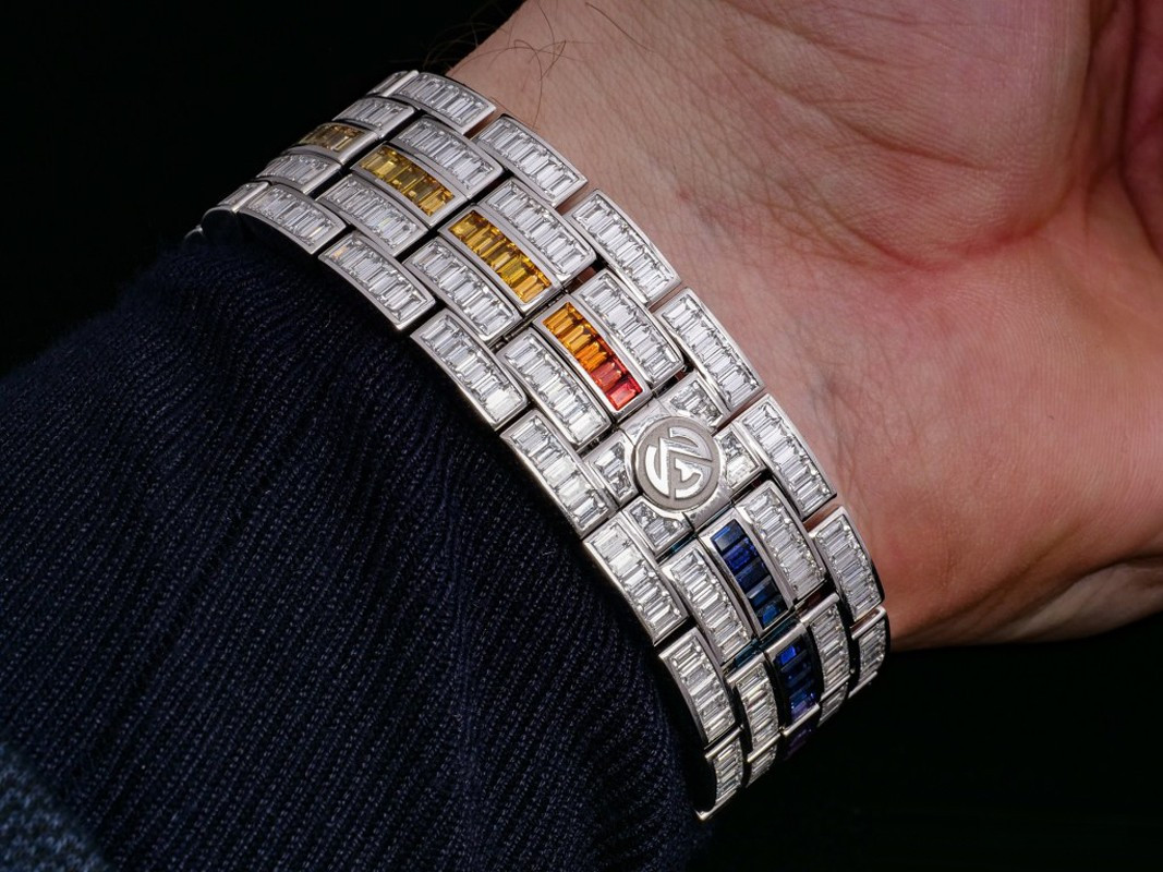 браслет из белого золота 18к, инкрустированный белыми багетными бриллиантами и разноцветными багетными сапфирами