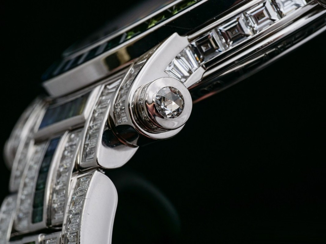водонепроницаемость 30 м, корпус инкрустирован белыми багетными бриллиантами