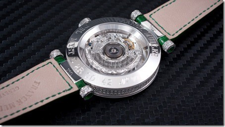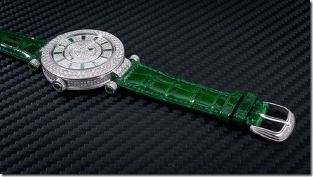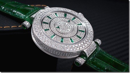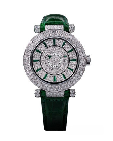 Впервые модель Double Mystery обладает циферблатом с двумя дисками, вращающимися с разной скоростью, что позволяет открыть взору абсолютную чистоту линий, гарантируя при этом отличную читабельность. Это усложнение свидетельствует об искусном механическом устройстве, скрывающемся под циферблатом. Блеск белых бриллиантов, изумрудов на циферблате и корпусе просто великолепен. Ничто не нарушает гармонию и изящность очертаний формы Cintrée Curvex, а также строгости округленного корпуса, скрывающего тайну усложнения. Модель представлена в 42-миллиметровом корпусе из белого золота. Часы поставляются на ремешке из кожи аллигатора с вставкой из белого золота. Водонепроницаемость - 30 метров.