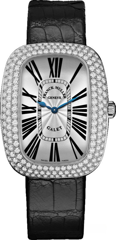 Часы Franck Muller Galet Automatic представлены в корпусе из белого золота 18к размером 37.7 х 47.15 мм и водонепроницаемостью 30 метров. Внутри корпуса установлен автоматический механизм, Калибр FM 800, обладающий запасом хода 42 часа. На серебристом гильошированном циферблате отображаются часы, минуты. Часы поставляются на ремешке из кожи аллигатора с золотой застежкой. Безель из белых бриллиантов.
