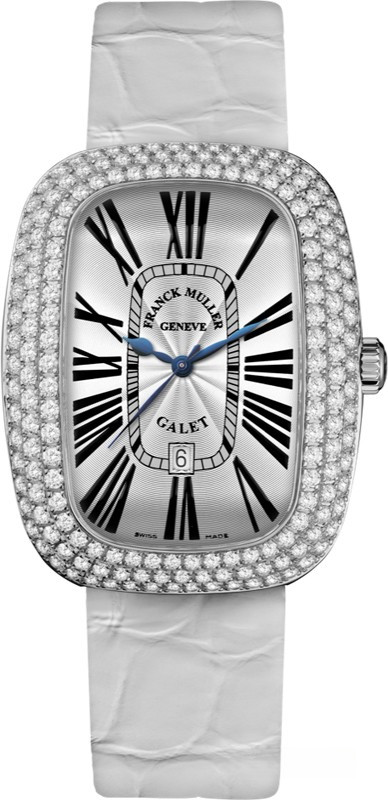 Часы Franck Muller Galet Automatic Date представлены в корпусе из белого золота 18к размером 37.7 х 47.15 мм и водонепроницаемостью 30 метров. Внутри корпуса установлен автоматический механизм, Калибр FM 800, обладающий запасом хода 42 часа. На серебристом гильошированном циферблате отображаются часы, минуты, секунды, дата. Часы поставляются на ремешке из кожи аллигатора с золотой застежкой. Безель из белых бриллиантов.