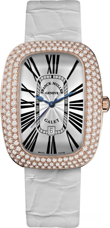 Часы Franck Muller Galet Automatic Date представлены в корпусе из розового золота 18к размером 37.7 х 47.15 мм и водонепроницаемостью 30 метров. Внутри корпуса установлен автоматический механизм, Калибр FM 800, обладающий запасом хода 42 часа. На серебристом гильошированном циферблате отображаются часы, минуты, секунды, дата. Часы поставляются на ремешке из кожи аллигатора с золотой застежкой. Безель из белых бриллиантов.