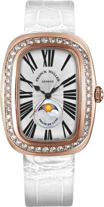 Часы Franck Muller Galet Moonphase представлены в корпусе из розового золота 18к размером 34.1 х 44 мм и водонепроницаемостью 30 метров. Внутри корпуса установлен автоматический механизм, Калибр FM 2038-L6, обладающий запасом хода 40 часов. На серебристом гильошированном циферблате отображаются часы, минуты, секунды, фаза луны. Часы поставляются на ремешке из кожи аллигатора с золотой застежкой. Безель из белых бриллиантов.
