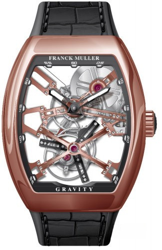 Корпус часов Franck Muller Gravity V 45 T GR CS SQT изготовлен из розового золота 18к, размером 44 x 53.7 x 15.8 мм. Рифленая заводная головка расположена на 3 часах. Сапфировое стекло защищает золотистый скелетированный циферблат. Модель оснащена мануфактурным швейцарским механизмом с ручным заводом и 7-дневным запасом хода, функциями индикации часов, минут (посредством соответствующих центральных стрелок) и секунд (индикатор на 6-ти часах). Поставляется на черном ремешке из кожи аллигатора с вставкой из розового золота 18к.