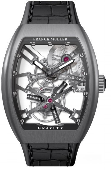 Корпус часов Franck Muller Gravity V 45 T GR CS SQT изготовлен из титана, размером 44 x 53.7 x 15.8 мм. Рифленая заводная головка расположена на 3 часах. Сапфировое стекло защищает серый скелетированный циферблат. Модель оснащена мануфактурным швейцарским механизмом с ручным заводом и 7-дневным запасом хода, функциями индикации часов, минут (посредством соответствующих центральных стрелок) и секунд (индикатор на 6-ти часах). Поставляется на черном ремешке из кожи аллигатора с вставкой из титана.