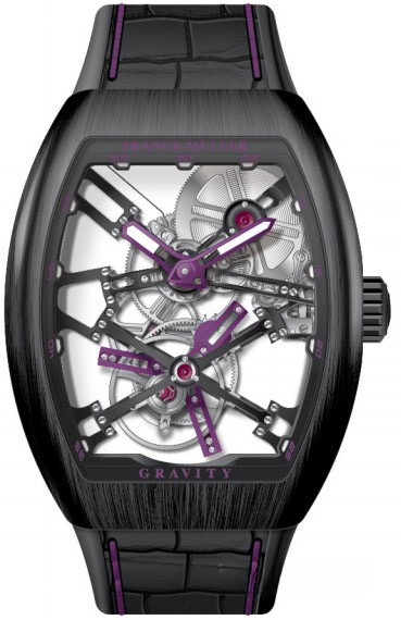 Корпус часов Franck Muller Gravity V 45 T GR CS SQT изготовлен из титана с черным покрытием DLC, размером 44 x 53.7 x 15.8 мм. Рифленая заводная головка расположена на 3 часах. Сапфировое стекло защищает черный скелетированный циферблат. Модель оснащена мануфактурным швейцарским механизмом с ручным заводом и 7-дневным запасом хода, функциями индикации часов, минут (посредством соответствующих центральных стрелок) и секунд (индикатор на 6-ти часах). Поставляется на черном ремешке из кожи аллигатора с вставкой из титана.