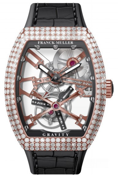 Корпус часов Franck Muller Gravity V 45 T GR CS SQT изготовлен из розового золота 18к, размером 44 x 53.7 x 15.8 мм. Рифленая заводная головка расположена на 3 часах. Сапфировое стекло защищает золотистый скелетированный циферблат. Модель оснащена мануфактурным швейцарским механизмом с ручным заводом и 7-дневным запасом хода, функциями индикации часов, минут (посредством соответствующих центральных стрелок) и секунд (индикатор на 6-ти часах). Поставляется на черном ремешке из кожи аллигатора с вставкой из розового золота 18к. Корпус инкрустирован белыми бриллиантами.
