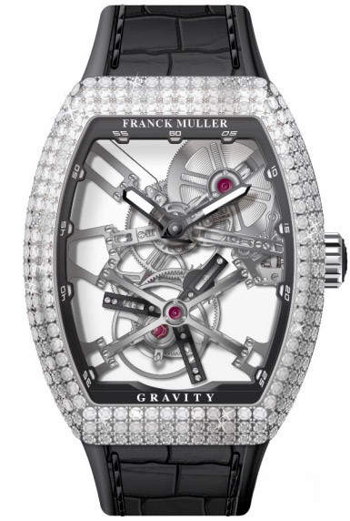 Корпус часов Franck Muller Gravity V 45 T GR CS SQT изготовлен из белого золота 18к, размером 44 x 53.7 x 15.8 мм. Рифленая заводная головка расположена на 3 часах. Сапфировое стекло защищает серебристый скелетированный циферблат. Модель оснащена мануфактурным швейцарским механизмом с ручным заводом и 7-дневным запасом хода, функциями индикации часов, минут (посредством соответствующих центральных стрелок) и секунд (индикатор на 6-ти часах). Поставляется на черном ремешке из кожи аллигатора с вставкой из белого золота 18к. Корпус инкрустирован белыми бриллиантами.