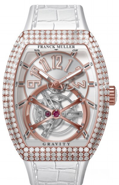 Модель Franck Muller Gravity V 45 T GRAVITY CS преставлена в корпусе из розового золота 18к, на ремешке белого цвета из кожи аллигатора. Каретка турбийона демонстрирует инновационную эллиптическую форму. Мост и основа традиционного турбийона имеют форму круга эллипса, диаметром 21,2 мм и высотой 7,7 мм. Его конструкция занимает всю нижнюю часть циферблата, совершая полный оборот каждые 60 секунд. Эксцентричный баланс диаметром 14 мм разместился возле нетрадиционного турбийона. Сквозь прозрачное сапфировое стекло можна насладится отделкой часового механизма с двух сторон корпуса. Верхняя часть циферблата серебристого цвета. Трехмерные арабские цифры занимают положение от 9 к 3 часам. Часовая и минутная стрелки имеют мечеобразную форму, заполнены люминесцентной краской. Водонепроницаемость корпуса до 30 метров. Внутри крупного бочкообразного корпуса размером 44 x 53.7 х 15.1 мм разместился часовой механизм с ручным заводом, Калибр CS-03, обладающий запасом хода 5 дней. Корпус инкрустирован белыми бриллиантами.