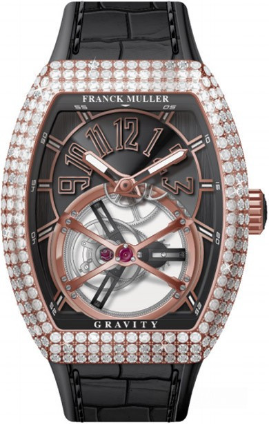 Модель Franck Muller Gravity V 45 T GRAVITY CS преставлена в корпусе из розового золота 18к, на ремешке черного цвета из кожи аллигатора. Каретка турбийона демонстрирует инновационную эллиптическую форму. Мост и основа традиционного турбийона имеют форму круга эллипса, диаметром 21,2 мм и высотой 7,7 мм. Его конструкция занимает всю нижнюю часть циферблата, совершая полный оборот каждые 60 секунд. Эксцентричный баланс диаметром 14 мм разместился возле нетрадиционного турбийона. Сквозь прозрачное сапфировое стекло можна насладится отделкой часового механизма с двух сторон корпуса. Верхняя часть циферблата черного цвета. Трехмерные арабские цифры занимают положение от 9 к 3 часам. Часовая и минутная стрелки имеют мечеобразную форму, заполнены люминесцентной краской. Водонепроницаемость корпуса до 30 метров. Внутри крупного бочкообразного корпуса размером 44 x 53.7 х 15.1 мм разместился часовой механизм с ручным заводом, Калибр CS-03, обладающий запасом хода 5 дней. Корпус инкрустирован белыми бриллиантами.