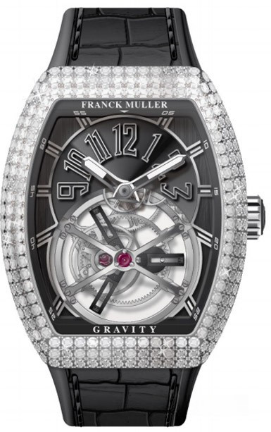 Модель Franck Muller Gravity V 45 T GRAVITY CS преставлена в корпусе из нержавеющей стали, на ремешке черного цвета из кожи аллигатора. Каретка турбийона демонстрирует инновационную эллиптическую форму. Мост и основа традиционного турбийона имеют форму круга эллипса, диаметром 21,2 мм и высотой 7,7 мм. Его конструкция занимает всю нижнюю часть циферблата, совершая полный оборот каждые 60 секунд. Эксцентричный баланс диаметром 14 мм разместился возле нетрадиционного турбийона. Сквозь прозрачное сапфировое стекло можна насладится отделкой часового механизма с двух сторон корпуса. Верхняя часть циферблата черного цвета. Трехмерные арабские цифры занимают положение от 9 к 3 часам. Часовая и минутная стрелки имеют мечеобразную форму, заполнены люминесцентной краской. Водонепроницаемость корпуса до 30 метров. Внутри крупного бочкообразного корпуса размером 44 x 53.7 х 15.1 мм разместился часовой механизм с ручным заводом, Калибр CS-03, обладающий запасом хода 5 дней. Корпус инкрустирован белыми бриллиантами.