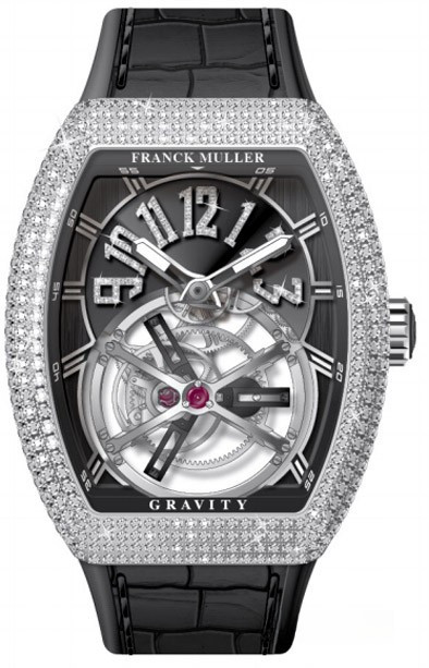 Модель Franck Muller Gravity V 45 T GRAVITY CS преставлена в корпусе из белого золота 18к, на ремешке черного цвета из кожи аллигатора. Каретка турбийона демонстрирует инновационную эллиптическую форму. Мост и основа традиционного турбийона имеют форму круга эллипса, диаметром 21,2 мм и высотой 7,7 мм. Его конструкция занимает всю нижнюю часть циферблата, совершая полный оборот каждые 60 секунд. Эксцентричный баланс диаметром 14 мм разместился возле нетрадиционного турбийона. Сквозь прозрачное сапфировое стекло можна насладится отделкой часового механизма с двух сторон корпуса. Верхняя часть циферблата черного цвета. Трехмерные арабские цифры занимают положение от 9 к 3 часам. Часовая и минутная стрелки имеют мечеобразную форму, заполнены люминесцентной краской. Водонепроницаемость корпуса до 30 метров. Внутри крупного бочкообразного корпуса размером 44 x 53.7 х 15.1 мм разместился часовой механизм с ручным заводом, Калибр CS-03, обладающий запасом хода 5 дней. Корпус инкрустирован белыми бриллиантами.