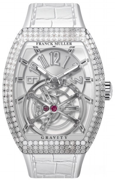 Модель Franck Muller Gravity V 45 T GRAVITY CS преставлена в корпусе из белого золота 18к, на ремешке белого цвета из кожи аллигатора. Каретка турбийона демонстрирует инновационную эллиптическую форму. Мост и основа традиционного турбийона имеют форму круга эллипса, диаметром 21,2 мм и высотой 7,7 мм. Его конструкция занимает всю нижнюю часть циферблата, совершая полный оборот каждые 60 секунд. Эксцентричный баланс диаметром 14 мм разместился возле нетрадиционного турбийона. Сквозь прозрачное сапфировое стекло можна насладится отделкой часового механизма с двух сторон корпуса. Верхняя часть циферблата серебристого цвета. Трехмерные арабские цифры занимают положение от 9 к 3 часам. Часовая и минутная стрелки имеют мечеобразную форму, заполнены люминесцентной краской. Водонепроницаемость корпуса до 30 метров. Внутри крупного бочкообразного корпуса размером 44 x 53.7 х 15.1 мм разместился часовой механизм с ручным заводом, Калибр CS-03, обладающий запасом хода 5 дней. Корпус инкрустирован белыми бриллиантами.