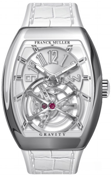 Модель Franck Muller Gravity V 45 T GRAVITY CS преставлена в корпусе из белого золота 18к, на ремешке белого цвета из кожи аллигатора. Каретка турбийона демонстрирует инновационную эллиптическую форму. Мост и основа традиционного турбийона имеют форму круга эллипса, диаметром 21,2 мм и высотой 7,7 мм. Его конструкция занимает всю нижнюю часть циферблата, совершая полный оборот каждые 60 секунд. Эксцентричный баланс диаметром 14 мм разместился возле нетрадиционного турбийона. Сквозь прозрачное сапфировое стекло можна насладится отделкой часового механизма с двух сторон корпуса. Верхняя часть циферблата серебристого цвета. Трехмерные арабские цифры занимают положение от 9 к 3 часам. Часовая и минутная стрелки имеют мечеобразную форму, заполнены люминесцентной краской. Водонепроницаемость корпуса до 30 метров. Внутри крупного бочкообразного корпуса размером 44 x 53.7 х 15.1 мм разместился часовой механизм с ручным заводом, Калибр CS-03, обладающий запасом хода 5 дней.