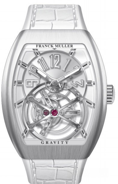 Модель Franck Muller Gravity V 45 T GRAVITY CS преставлена в корпусе из белого золота 18к, на ремешке белого цвета из кожи аллигатора. Каретка турбийона демонстрирует инновационную эллиптическую форму. Мост и основа традиционного турбийона имеют форму круга эллипса, диаметром 21,2 мм и высотой 7,7 мм. Его конструкция занимает всю нижнюю часть циферблата, совершая полный оборот каждые 60 секунд. Эксцентричный баланс диаметром 14 мм разместился возле нетрадиционного турбийона. Сквозь прозрачное сапфировое стекло можна насладится отделкой часового механизма с двух сторон корпуса. Верхняя часть циферблата серебристого цвета. Трехмерные арабские цифры занимают положение от 9 к 3 часам. Часовая и минутная стрелки имеют мечеобразную форму, заполнены люминесцентной краской. Водонепроницаемость корпуса до 30 метров. Внутри крупного бочкообразного корпуса размером 44 x 53.7 х 15.1 мм разместился часовой механизм с ручным заводом, Калибр CS-03, обладающий запасом хода 5 дней.