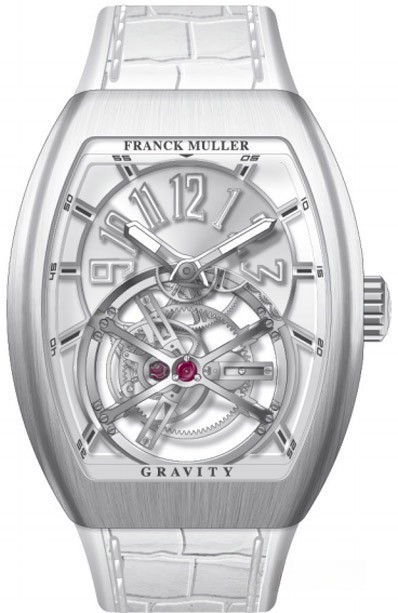 Модель Franck Muller Gravity V 45 T GRAVITY CS преставлена вкорпусе из нержавеющей стали, на ремешке белого цвета из кожи аллигатора. Каретка турбийона демонстрирует инновационную эллиптическую форму. Мост и основа традиционного турбийона имеют форму круга эллипса, диаметром 21,2 мм и высотой 7,7 мм. Его конструкция занимает всю нижнюю часть циферблата, совершая полный оборот каждые 60 секунд. Эксцентричный баланс диаметром 14 мм разместился возле нетрадиционного турбийона. Сквозь прозрачное сапфировое стекло можна насладится отделкой часового механизма с двух сторон корпуса. Верхняя часть циферблата серебристого цвета. Трехмерные арабские цифры занимают положение от 9 к 3 часам. Часовая и минутная стрелки имеют мечеобразную форму, заполнены люминесцентной краской. Водонепроницаемость корпуса до 30 метров. Внутри крупного бочкообразного корпуса размером 44 x 53.7 х 15.1 мм разместился часовой механизм с ручным заводом, Калибр CS-03, обладающий запасом хода 5 дней.