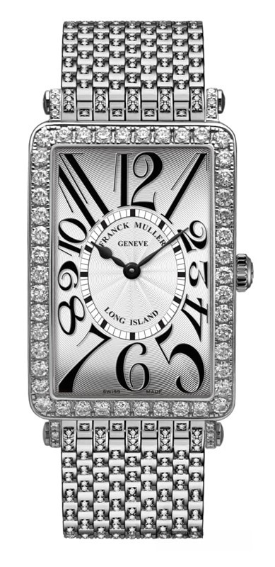 Часы Franck Muller Long Island представлены в корпусе из нержавеющей стали размером 44.55 х 26 х 7.05 мм водонепроницаемостью 30 метров. Внутри корпуса установлен автоматический механизм, Калибр FM 800, обладающий запасом хода 42 часа. На серебристом гильошированном циферблате отображаются часы, минуты. Часы поставляются на браслете из нержавеющей стали, инкрустированным белыми бриллиантами. Корпус инкрустирован белыми бриллиантами.
