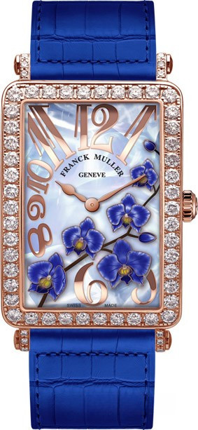 Корпус часов изготовлен из розового золота 18к. Размер корпуса 22.9 х 40 мм, водонепроницаемость до 30 м. Циферблат голубой жемчужный с синими орхидеями. На нем отображаются часы, минуты. Часы комплектуются автоматическим механизмом FM 800. Поставлется на ремешке из кожи аллигатора с вставкой из розового золота 18к. Корпус инкрустирован белыми бриллиантами.
