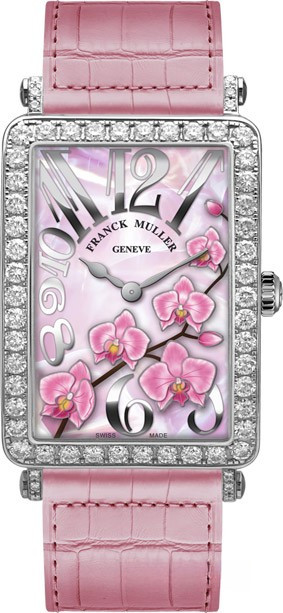 Корпус часов изготовлен из белого золота 18к. Размер корпуса 22.9 х 40 мм, водонепроницаемость до 30 м. Циферблат розовый жемчужный с розовыми орхидеями. На нем отображаются часы, минуты. Часы комплектуются автоматическим механизмом FM 800. Поставлется на ремешке из кожи аллигатора с вставкой из белого золота 18к. Корпус инкрустирован белыми бриллиантами.