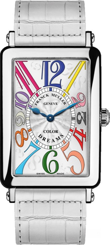Часы Franck Muller Long Island Color Dreams представлены в корпусе из белого золота 18к размером 39.5 х 55.3 мм и водонепроницаемостью 30 метров. Внутри корпуса установлен автоматический механизм, обладающи запасом хода 42 часа. На белом циферблате отображаются часы, минуты. Часы поставляются на ремешке из кожи аллигатора с золотой застежкой.