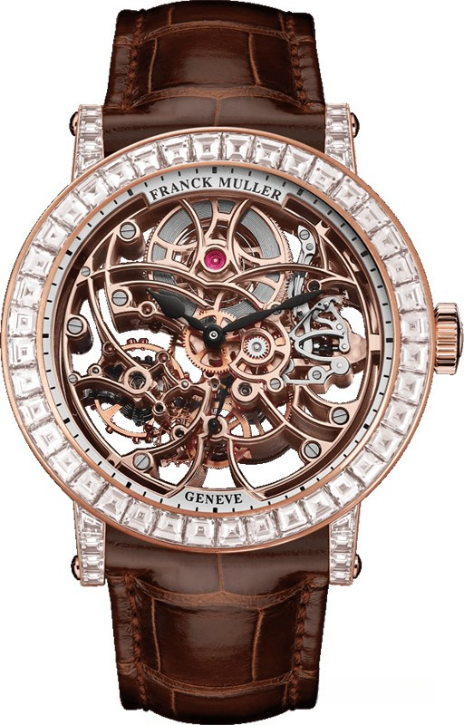 Часы Franck Muller Round Skeleton представлены в корпусе из розового золота 18к размером 45 х 11.2 мм водонепроницаемостью 30 метров. Внутри корпуса находится механизм с ручным заводом, обладающий запсом хода 7 дней. На скелетированном циферблате отображаются часы, минуты, секунды. Часы поставляются на ремешке из кожи аллигатора с вставкой из розового золота 18к. Корпус инкрустирован белыми багетными бриллиантами.