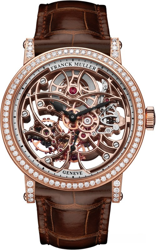 Часы Franck Muller Round Skeleton представлены в корпусе из розового золота 18к размером 45 х 11.2 мм водонепроницаемостью 30 метров. Внутри корпуса находится механизм с ручным заводом, обладающий запсом хода 7 дней. На скелетированном циферблате отображаются часы, минуты, секунды. Часы поставляются на ремешке из кожи аллигатора с вставкой из розового золота 18к. Корпус инкрустирован белыми бриллиантами.