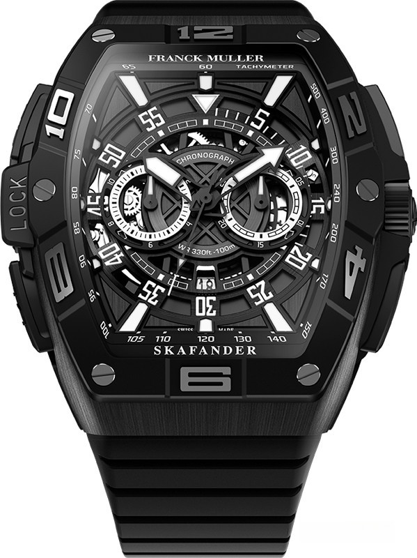 Часы Franck Muller Skafander Chronograph представлены в корпусе из титана с покрытием DLC размером 46 х 57 мм водонепроницаемостью 100 метров. Внутри корпуса находится автоматический механизм, Калибр FM 2800-SK-CC, обладающий запасом хода 42 часа. На черном циферблате отображаются часы, минуты, секунды, дата. Часы поставляются на каучуковом ремешке с вставкой из титана.