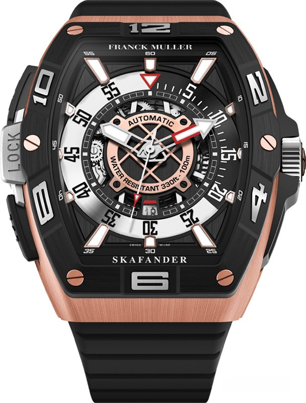 Часы Franck Muller Skafander Classic представлены в корпусе из розового золота 18к и нержавеющей стали с покрытием DLC размером 44 х 54 мм водонепроницаемостью 100 метров. Внутри корпуса находится автоматический механизм, обладающий запасом хода 42 часа. На черном циферблате отображаются часы, минуты, секунды, дата. Часы поставляются на каучуковом ремешке с вставкой из розового золота 18к.