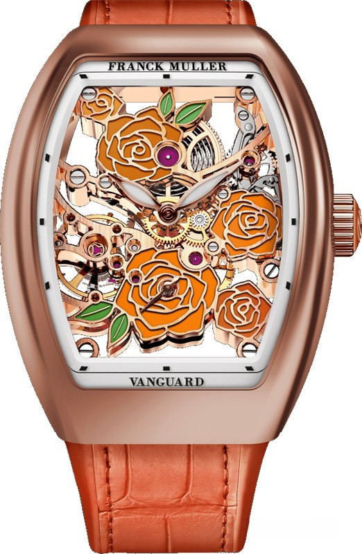 Часы Franck Muller Vanguard Lady Rose Skeleton представлены в корпусе из розового золота 18к размером 32 x 42.3 x 9.9 мм водонепроницаемостью 30 метров. Внутри корпуса находится механизм с ручным заводом, Калибр 1540 VS1, обладающий запасом хода 4 дня. На оранжевом циферблате отображаются часы, минуты, секунды. Часы поставляются на ремешке из кожи аллигатора с вставкой из розового золота 18к.