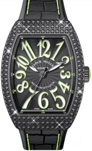 Корпус часов Franck Muller Vanguard Lady V 35 SC AT изготовлен из нержавеющей стали с черным покрытием DLC, размером 35 х 50 мм. Рифленая заводная головка расположена на 3 часах. Сапфировое стекло защищает черный гильошированный циферблат с арабскими цифрами, часовой, минутной и секундной стрелками. Модель оснащена мануфактурным швейцарским автоматическим механизмом с 42-часовым запасом хода, функциями индикации часов, минут и секунд (посредством соответствующих центральных стрелок). Поставляется на черном ремешке из кожи аллигатора с вставкой из нержавеющей стали. Корпус инкрустирован черными бриллиантами.