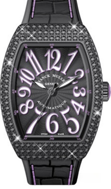 Корпус часов Franck Muller Vanguard Lady V 35 SC AT изготовлен из нержавеющей стали с черным покрытием DLC, размером 35 х 50 мм. Рифленая заводная головка расположена на 3 часах. Сапфировое стекло защищает черный гильошированный циферблат с арабскими цифрами, часовой, минутной и секундной стрелками. Модель оснащена мануфактурным швейцарским автоматическим механизмом с 42-часовым запасом хода, функциями индикации часов, минут и секунд (посредством соответствующих центральных стрелок). Поставляется на черном ремешке из кожи аллигатора с вставкой из нержавеющей стали. Корпус инкрустирован черными бриллиантами.