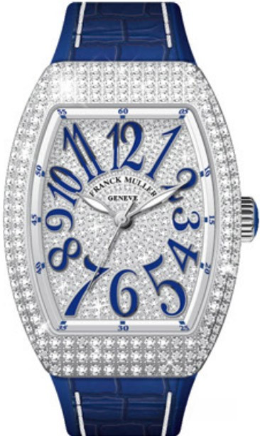 Корпус часов Franck Muller Vanguard Lady V 35 SC AT изготовлен из белого золота 18к, размером 35 х 50 мм. Рифленая заводная головка расположена на 3 часах. Сапфировое стекло защищает циферблат с белыми бриллиантами и арабскими цифрами, часовой, минутной и секундной стрелками. Модель оснащена мануфактурным швейцарским автоматическим механизмом с 42-часовым запасом хода, функциями индикации часов, минут и секунд (посредством соответствующих центральных стрелок). Поставляется на синем ремешке из кожи аллигатора с вставкой из белого золота 18к. Корпус инкрустирован белыми бриллиантами.