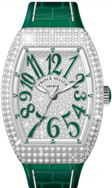 Корпус часов Franck Muller Vanguard Lady V 35 SC AT изготовлен из белого золота 18к, размером 35 х 50 мм. Рифленая заводная головка расположена на 3 часах. Сапфировое стекло защищает циферблат с белыми бриллиантами и арабскими цифрами, часовой, минутной и секундной стрелками. Модель оснащена мануфактурным швейцарским автоматическим механизмом с 42-часовым запасом хода, функциями индикации часов, минут и секунд (посредством соответствующих центральных стрелок). Поставляется на зеленом ремешке из кожи аллигатора с вставкой из белого золота 18к. Корпус инкрустирован белыми бриллиантами.