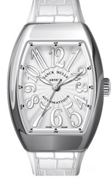 Корпус часов Franck Muller Vanguard Lady V 35 SC AT изготовлен из нержавеющей стали, размером 35 х 50 мм. Рифленая заводная головка расположена на 3 часах. Сапфировое стекло защищает серебристый гильошированный циферблат с арабскими цифрами, часовой, минутной и секундной стрелками. Модель оснащена мануфактурным швейцарским автоматическим механизмом с 42-часовым запасом хода, функциями индикации часов, минут и секунд (посредством соответствующих центральных стрелок). Поставляется на белом ремешке из кожи аллигатора с вставкой из нержавеющей стали.