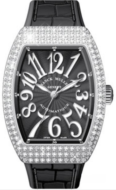 Корпус часов Franck Muller Vanguard Lady V 35 SC AT изготовлен из белого золота 18к, размером 35 х 50 мм. Рифленая заводная головка расположена на 3 часах. Сапфировое стекло защищает черном гильошированном циферблат с арабскими цифрами, часовой, минутной и секундной стрелками. Модель оснащена мануфактурным швейцарским автоматическим механизмом с 42-часовым запасом хода, функциями индикации часов, минут и секунд (посредством соответствующих центральных стрелок). Поставляется на черном ремешке из кожи аллигатора с вставкой из белого золота 18к. Корпус инкрустирован белыми бриллиантами.