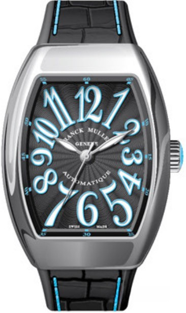 Корпус часов Franck Muller Vanguard Lady V 35 SC AT изготовлен из белого золота 18к, размером 35 х 50 мм. Рифленая заводная головка расположена на 3 часах. Сапфировое стекло защищает черный гильошированный циферблат с арабскими цифрами, часовой, минутной и секундной стрелками. Модель оснащена мануфактурным швейцарским автоматическим механизмом с 42-часовым запасом хода, функциями индикации часов, минут и секунд (посредством соответствующих центральных стрелок). Поставляется на черном ремешке из кожи аллигатора с вставкой из белого золота 18к.