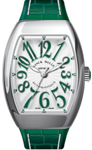 Корпус часов Franck Muller Vanguard Lady V 35 SC AT изготовлен из белого золота 18к, размером 35 х 50 мм. Рифленая заводная головка расположена на 3 часах. Сапфировое стекло защищает серебристый гильошированный циферблат с арабскими цифрами, часовой, минутной и секундной стрелками. Модель оснащена мануфактурным швейцарским автоматическим механизмом с 42-часовым запасом хода, функциями индикации часов, минут и секунд (посредством соответствующих центральных стрелок). Поставляется на зеленом ремешке из кожи аллигатора с вставкой из белого золота 18к.