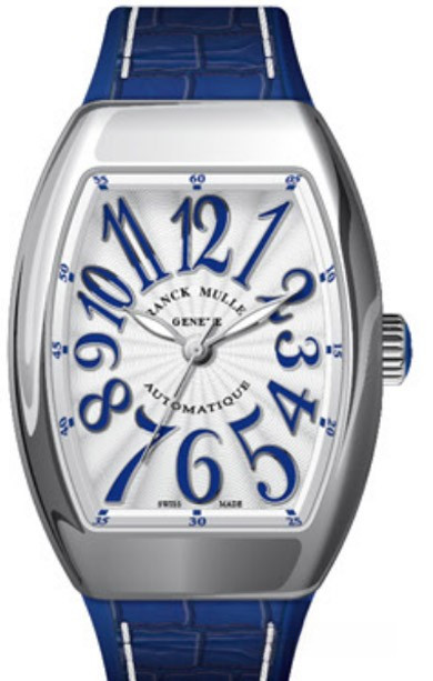 Корпус часов Franck Muller Vanguard Lady V 35 SC AT изготовлен из нержавеющей стали, размером 35 х 50 мм. Рифленая заводная головка расположена на 3 часах. Сапфировое стекло защищает серебристый гильошированный циферблат с арабскими цифрами, часовой, минутной и секундной стрелками. Модель оснащена мануфактурным швейцарским автоматическим механизмом с 42-часовым запасом хода, функциями индикации часов, минут и секунд (посредством соответствующих центральных стрелок). Поставляется на синем ремешке из кожи аллигатора с вставкой из нержавеющей стали.