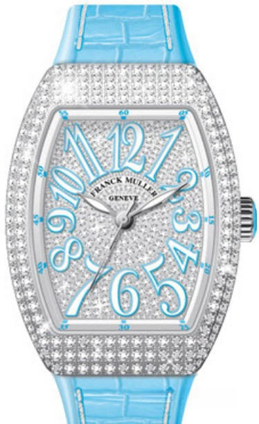 Корпус часов Franck Muller Vanguard Lady V 35 SC AT изготовлен из белого золота 18к, размером 35 х 50 мм. Рифленая заводная головка расположена на 3 часах. Сапфировое стекло защищает циферблат с белыми бриллиантами и арабскими цифрами, часовой, минутной и секундной стрелками. Модель оснащена мануфактурным швейцарским автоматическим механизмом с 42-часовым запасом хода, функциями индикации часов, минут и секунд (посредством соответствующих центральных стрелок). Поставляется на голубом ремешке из кожи аллигатора с вставкой из белого золота 18к. Корпус инкрустирован белыми бриллиантами.