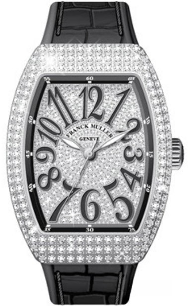 Корпус часов Franck Muller Vanguard Lady V 35 SC AT изготовлен из белого золота 18к, размером 35 х 50 мм. Рифленая заводная головка расположена на 3 часах. Сапфировое стекло защищает циферблат с белыми бриллиантами и арабскими цифрами, часовой, минутной и секундной стрелками. Модель оснащена мануфактурным швейцарским автоматическим механизмом с 42-часовым запасом хода, функциями индикации часов, минут и секунд (посредством соответствующих центральных стрелок). Поставляется на черном ремешке из кожи аллигатора с вставкой из белого золота 18к. Корпус инкрустирован белыми бриллиантами.