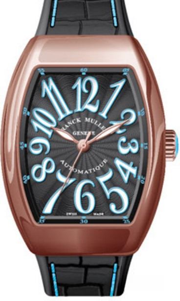 Корпус часов Franck Muller Vanguard Lady V 35 SC AT изготовлен из розового золота 18к, размером 35 х 50 мм. Рифленая заводная головка расположена на 3 часах. Сапфировое стекло защищает черный гильошированный циферблат с арабскими цифрами, часовой, минутной и секундной стрелками. Модель оснащена мануфактурным швейцарским автоматическим механизмом с 42-часовым запасом хода, функциями индикации часов, минут и секунд (посредством соответствующих центральных стрелок). Поставляется на черном ремешке из кожи аллигатора с вставкой из розового золота 18к.