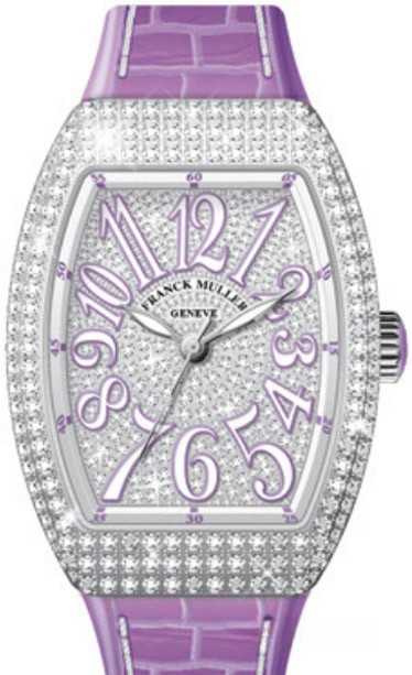 Корпус часов Franck Muller Vanguard Lady V 35 SC AT изготовлен из белого золота 18к, размером 35 х 50 мм. Рифленая заводная головка расположена на 3 часах. Сапфировое стекло защищает циферблат с белыми бриллиантами и арабскими цифрами, часовой, минутной и секундной стрелками. Модель оснащена мануфактурным швейцарским автоматическим механизмом с 42-часовым запасом хода, функциями индикации часов, минут и секунд (посредством соответствующих центральных стрелок). Поставляется на сиреневом ремешке из кожи аллигатора с вставкой из белого золота 18к. Корпус инкрустирован белыми бриллиантами.